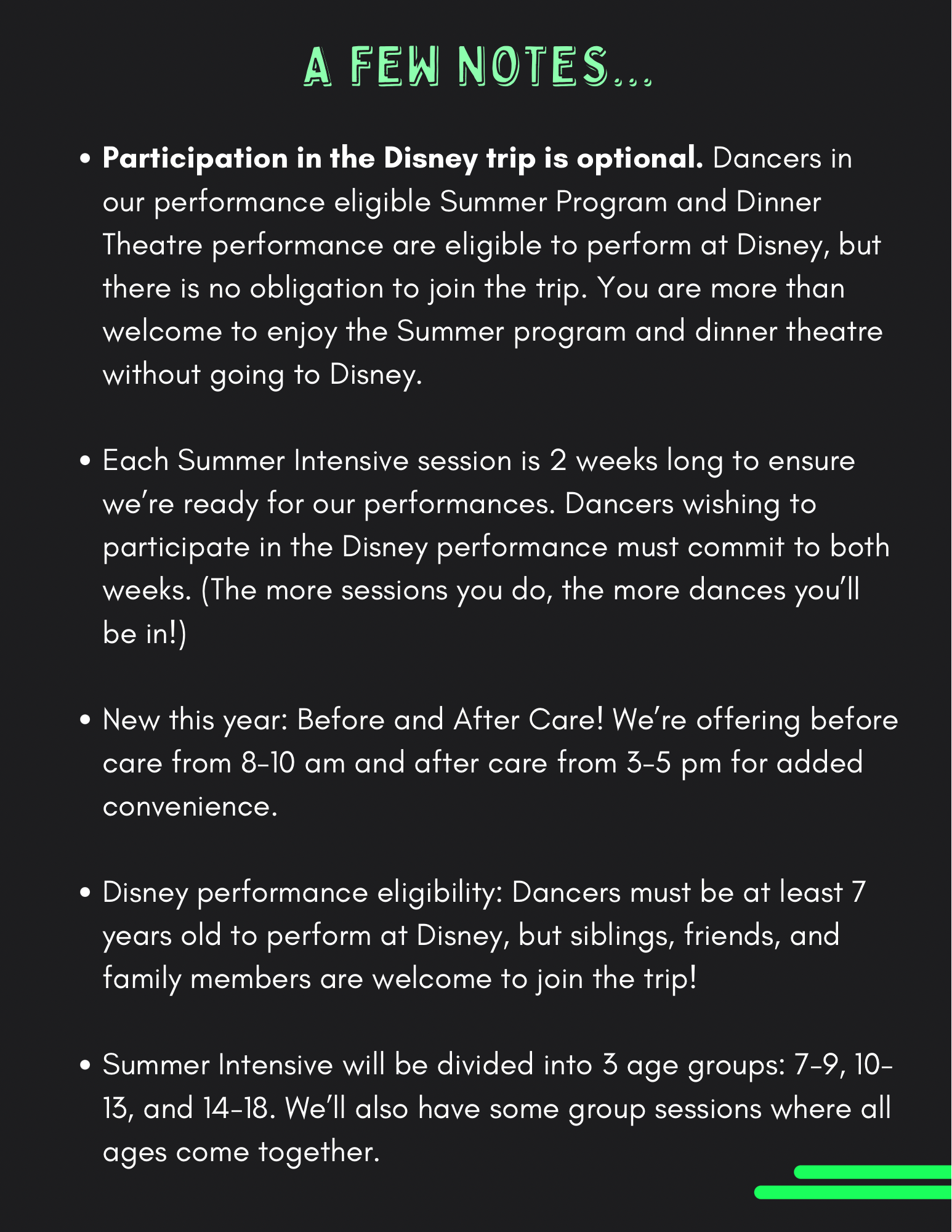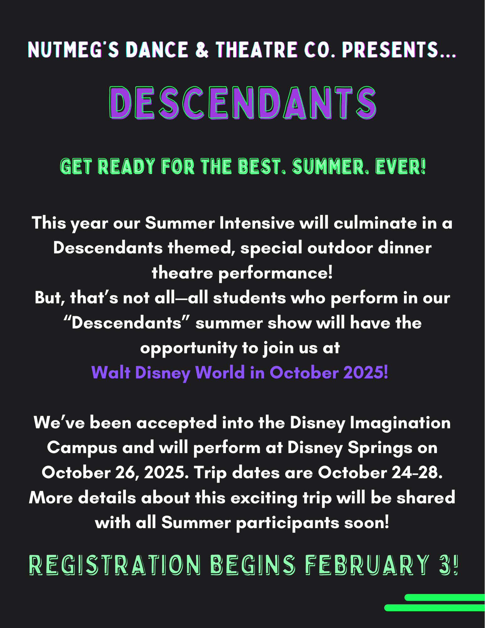 Hi, recital season is here! We have sent emails, published the information in the Facebook group, and also on our blog. You can find rectial information on our website and in our Facebook Group . T-Shirts: If your dancer (or you) would like a t-shirt with this year's show poster design on the front, orders must be received by April 16 . If you are in the finale, this shirt is your costume You can place your order here: https://nutmegsdance.square.site/shop/2024-show-t-shirts/5 Rehearsals: You can find our rehearsal schedule here: Ticket Sales: Tickets for the show will go on sale Monday, April 22 at 10 am . I will be sending another email out with additional ticket information. Program Ads/Messages: If you would like to send your dancer an ad or message in the program, please email your desired ad or message to 3darlene.dkd@gmail.com by April 22nd. (You are welcome to put photos or graphics in your ad.) Ad/Message pricing: Standard Message: $20 (30 word limit) 1/4 page ad: $35.00 1/2 page ad: $60.00 Full page ad: $90.00 Inside front cover: $120.00 Inside back cover: $120.00 Payment can be made through Venmo: HeyMeg_Funk - thank you! *Please note that our programs will be digital this year, but we will be offering hard copy programs for purchase. Thank you. Show Order: You can find the tentative order for each show here: (Please note that each order is slightly different as we have a different group in each show, so please check closely.) Friday, May 3 Show Order Saturday, May 4 at 1:00 pm Saturday, May 4 at 6:00 pm Who's in What Show: As a reminder, this is who is performing in each show. (If your dance is not listed below, you are B Level or older, and will be performing in all 3 shows.) Wipeout ( Tumbling Tots ): Friday May 3 at 7 pm, Saturday May 4 at 1 pm Eye of the Tiger ( Beginning Dance ): Friday, May 3 at 7 pm, Saturday, May 4 at 1 pm All American Girl ( Beginning Dance ): Friday, May 3 at 7 pm, Saturday, May 4 at 6 pm Dig a Little Deeper ( Ballet/Tap Combo ): Friday, May 3 at 7 pm, Saturday, May 4 at 1 pm Wake Me Up Before You Go Go ( Hip Hop A ): Friday, May 3 at 7 pm, Saturday May 4 at 6 pm The Great Fairy Fountain ( Ballet A ): Friday, May 3 at 7 pm, Saturday May 4 at 6 pm This is Halloween ( Beg. Acro ): Saturday, May 4 at 1 pm, Saturday, May 4 at 6 pm School of Rock ( Beg. Musical Theatre ): Friday, May 3 at 7 pm, Saturday, May 4 at 6 pm Hardware Store ( Boys Hip Hop ): Friday, May 3 at 7 pm, Saturday May 4 at 6 pm He Mele No Lilo ( Beg. World Dance ): Saturday, May 4 at 1 pm, Saturday, May 4 at 6 pm Boogie Shoes ( Beg. Tap ): Saturday, May 4 at 1 pm, Saturday, May 4 at 6 pm Hawaiian Roller Coaster Ride (Pre-Ballet) : Friday, May 3 at 7 pm, Saturday, May 4 at 1 pm